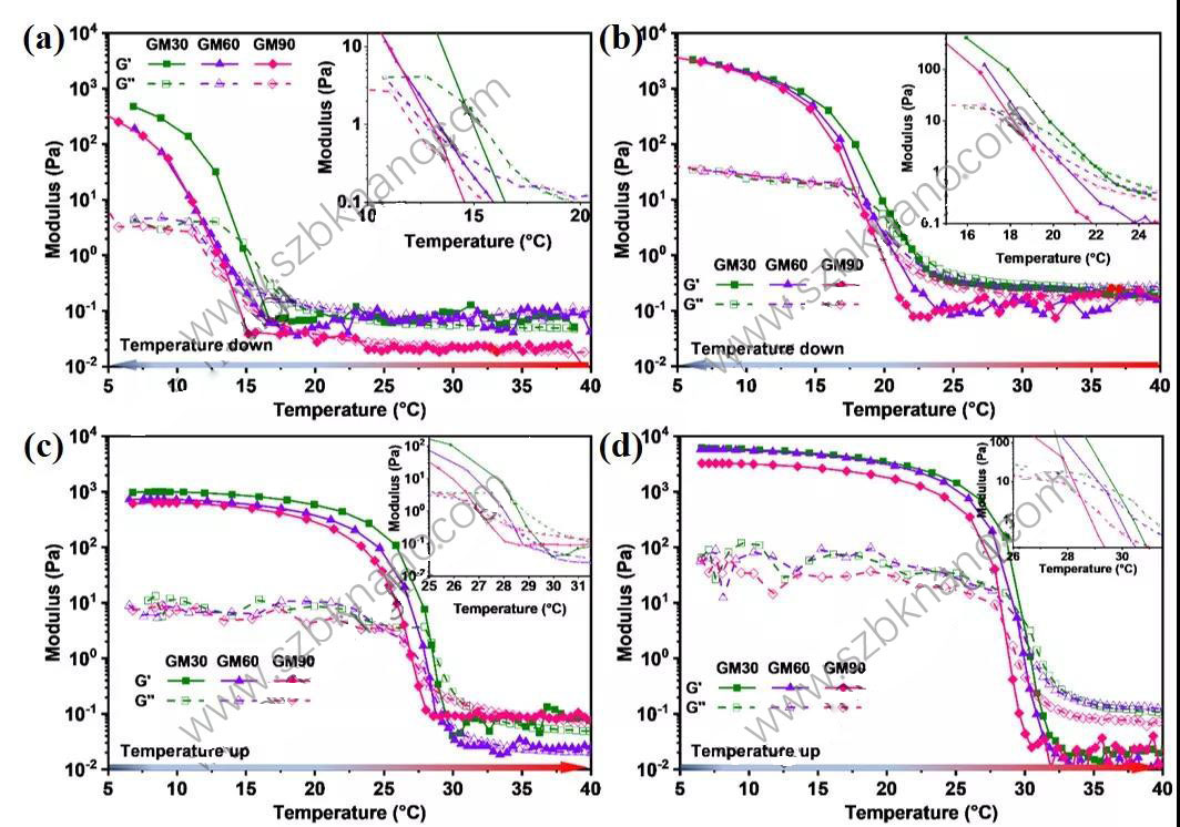 圖2 三種型號GelMA水溶液的降溫sol-gel轉變過程,GelMA濃度分別為5 % (a)和10 % (b);及升溫gel-sol轉變過程,GelMA 濃度分別為5 % (c)和10 % (d)