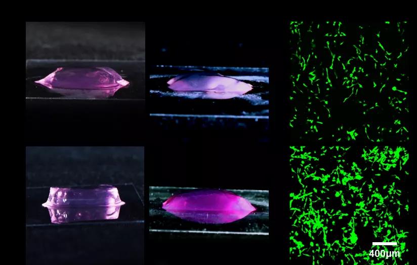 雖然水凝膠內部也自帶孔隙結構,但其孔隙過小,使得包裹細胞進行三維培養及生物3D打印時內部的養物質傳輸及細胞代謝廢物排出不暢,致密的孔隙阻礙了細胞更好的功能化。為了提高水凝膠內細胞與外界的物質交換效率,并為細胞生長增殖提供更多空間,團隊持續攻關,成功研制出了高孔隙率GelMA水凝膠