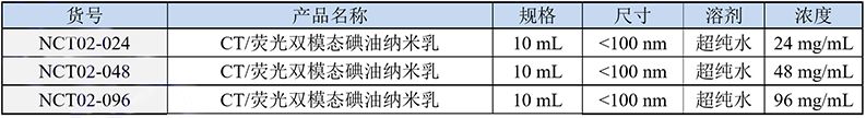 蘇州北科納米科技有限公司提供高質量的CT/熒光雙模態碘油納米乳,為乳白色泛綠澄清液體,分散于純水中,已采用0.22微米濾膜過濾并除菌。尺寸、碘濃度、熒光強度在一定范圍內可調、CT成像對比增強效果佳、低腎毒性、安全環保無污染,具有很好的分散性、穩定性佳,可用于小鼠腫瘤模型及其他模型CT熒光雙模態成像等。