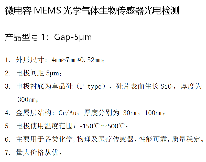 微電容叉指金電極MEMS光學氣體生物傳感器光電檢測單電極