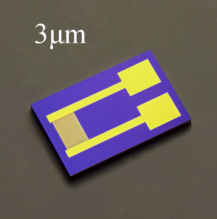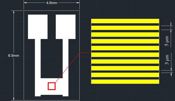 2.線寬:5 u m,線距:3 u m,指長:1.6mm,叉指對數:75(150指).