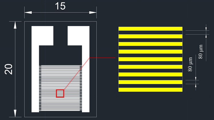 2.線寬:80um,線距:8oum,指長(zhǎng):8.5mm,叉指對(duì)數(shù): 30(60指).