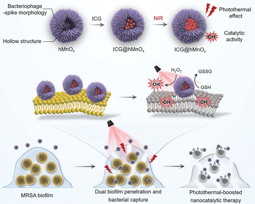 【主要優勢】1、ICG@hMnOx展示了一種特殊的能力,深入穿透生物膜,由于其明顯的光熱效應,破壞生物膜的緊密結構;2、病毒刺狀表面顯著增強了ICG@hMnOx的細菌捕獲能力。該表面作為活性氧的膜錨定發生器和谷胱甘肽清除劑,促進局部光熱促進催化細菌消毒,使用ICG@hMnOx可以有效治療耐甲氧西林金黃色葡萄球菌相關的生物膜感染