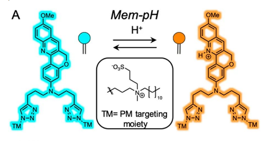 其他說明:密封狀態下保質期半年【主要優勢】基于鉻喹啉的熒光比率pH探針,具有吸引人的光物理性質,它針對細胞的質膜(PM),并通過內吞作用進一步在細胞內囊泡中積累。Mem-pH向囊泡腔的暴露允許通過整個內吞途徑監測囊泡的酸化,并通過比值成像測量其pH。