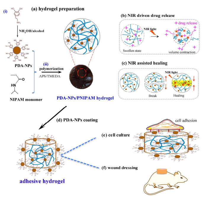 Polydopamine nanoparticles modulating stimuliresponsive PNIPAM hydrogels with cell/tissue adhesiveness
