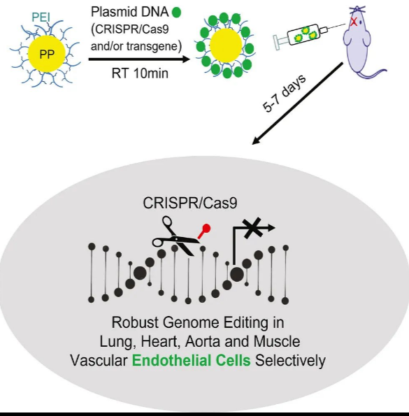 其他說明:密封狀態下保質期半年【主要優勢】PEG-b-PLGA,將CRISPR-Cas9基因編輯系統地送到血管內皮細胞,并成功進行了基因編輯。這種納米顆粒具有優異的血管遞送生物分布,且沒有特定的肝臟聚集。該系統可以導入外源基因來抑制血管損傷和/或促進血管修復,也可以遞送基因編輯系統來糾正基因突變、打開或關閉特定基因。而且該遞送系統還可以同時編輯多個基因。