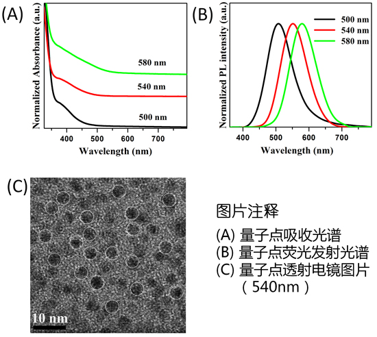 蘇州北科納米科技有限公司生產的油溶性Cu摻雜ZnInS 量子點產品,平均的量子產率為50%,儲存時應避免陽光直射,4度密封暗處保存,可以為客戶訂制生產500nm~700nm任一波長不同克數的產品。本產品具有粒徑均一,吸收光譜寬泛,發射光譜對稱,熒光強度高而穩定等特點,可應用于太陽能電池、發光器件與生物熒光標記等領域。  本產品為無鎘量子點。