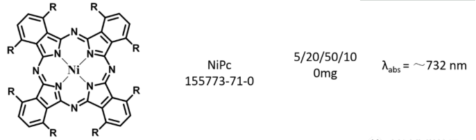 金屬酞菁類熒光材料為綠色固體,易溶于有機溶劑,吸收/熒光波長位于近紅外區,在熒光成像,光聲成像,核磁共振成像,光熱治療,光動力學治療,聲動力學治療以及三重態-三重態湮滅上轉換(TTA)等領域均具有廣泛的應用前景。