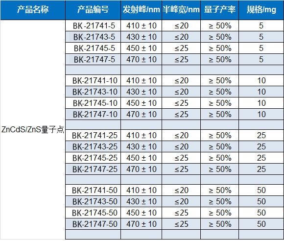 The water-soluble ZnCdS/ZnS quantum dot products produced by Suzhou Beike Nano Technology Co., Ltd. are based on ZnCdS as the core, ZnS as the shell, and core/shell type fluorescent nanomaterials coated with hydrophilic ligands. The average quantum yield is 50%, avoid direct sunlight during storage, and store in a 4 degree sealed dark place. Products with any wavelength from 400nm to 480nm can be customized for customers. This product has the characteristics of uniform particle size, broad absorption spectrum, narrow and symmetric emission spectrum, and high and stable fluorescence intensity.