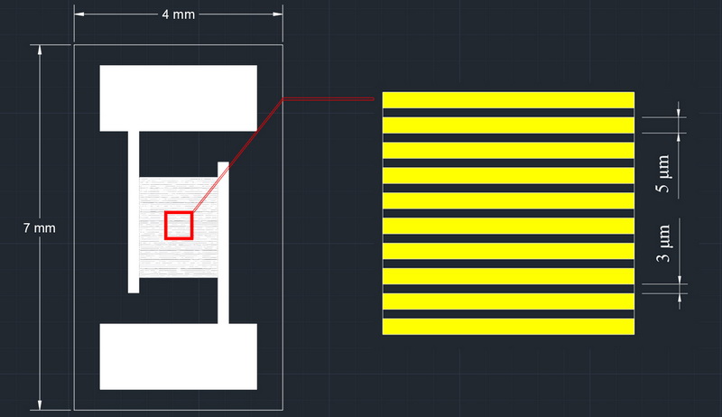 2. Line spacing: 3 u m, line width: 5 u m, finger length: 1.5mm, interdigital logarithm: 120 (240 finger).