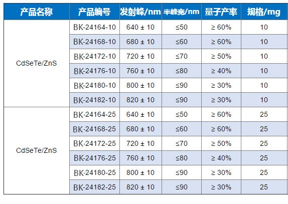 The oil-soluble CdSeTe/ZnS quantum dot products produced by Suzhou Beike Nano Technology Co., Ltd. are based on CdSeTe as the core, ZnS as the shell, and core/shell fluorescent nanomaterials coated with hydrophobic ligands. The average quantum yield is 50. %. Avoid direct sunlight during storage, and store in a 4 degree sealed dark place. Products with different wavelengths from 640nm to 820nm can be customized for customers. This product has the characteristics of uniform particle size, broad absorption spectrum, symmetrical emission spectrum, high and stable fluorescence intensity, etc., and can be used in solar cells, light-emitting devices, and bioluminescent labels.