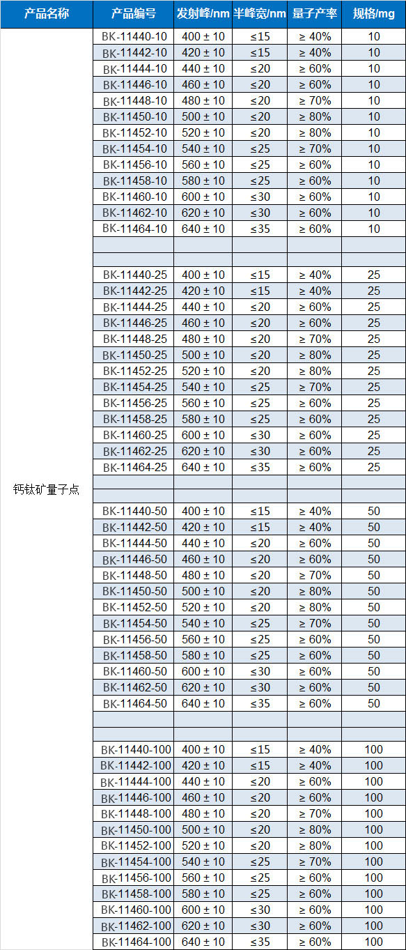 The oil-soluble perovskite quantum dot product produced by Suzhou Beike Nanotechnology Co., Ltd. is a fluorescent nanomaterial with CsPbX3 (X=Cl, Br, I), the surface is covered by a hydrophobic ligand, and the average quantum yield is 70%. The solvent is n-hexane. Avoid direct sunlight during storage. Store in a sealed dark place at 4°C. Products with different wavelengths from 400nm to 650nm can be customized for customers. This product has the characteristics of uniform particle size, wide absorption spectrum, narrow and symmetrical emission spectrum, and high and stable fluorescence intensity. It can be used in the fields of liquid crystal display, light-emitting diode, solar cell, light-emitting device, and biofluorescent label.