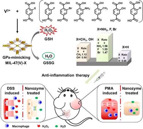 [Main advantages] 1, MIL-47 (V) -NH2 MOF nano-enzyme not only has good biocompatibility, but also an effective ROS scavenger to protect cells from oxidative damage; 2, broad anti-inflammatory effect of GPx-like MIL-47 (V) -NH 2 nano-enzyme on ear inflammation and enteritis; 3, high-activity MIL-47 (V) -NH2 is better than low-activity MIL-47 (V) -H.