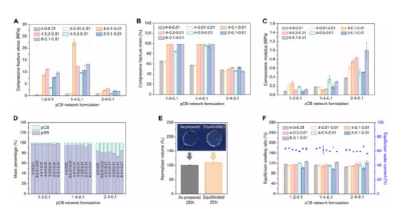 首先對pCB/pCB水凝膠進行了正交壓縮試驗,以檢驗pSB不是主要成分網絡時的效果(圖3,A,D和E)。不出所料,在沒有pSB作為鎖定主要成分網絡的情況下,所有pCB/pCB水凝膠在水中達到平衡后都表現出較大的體積增加(圖3F),從而導致較弱的機械性能。在所有pCB/pCB組合中,最高的斷裂應力僅為pCB /pSB ZEN水凝膠的五分之一。在pSB/pCB系統中(圖3,B,D,E和F),其中pSB是次要組分網絡,由于水凝膠在達到平衡后增加了其原始大小的120%,因此也沒有鎖定作用。斷裂應力僅為1 MPa左右。另一方面,在pSB/pSB系統中(圖3,C至F),如預期的那樣觀察到了鎖定效果,并且平衡體積略有增加,約為7.9%。