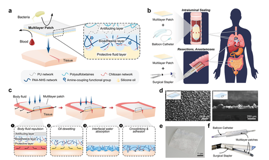 圖1 a)生物粘附貼劑的多層組成的示意圖。該貼劑包括帶紋理的生物粘合劑,在非粘合側融合了防污聚合物層,并在粘合側被疏水性流體層潤濕,以排斥體液。b)通過氣囊導管對管狀器官和結構進行腔內密封的多層貼片的示例性微創外科手術示例,以及在切除和吻合中用于線性密封的外科吻合器。c)多層貼劑的粘附機理示意圖。(1)當將貼劑朝組織方向移動時,疏水性保護層排斥血液并防止污染生物粘附層。(2)施加超過77.5 kPa的壓力會導致油從生物粘附層中脫濕。(3)生物粘附層與組織表面接觸并立即吸收界面水,形成暫時的交聯。(4)在生物粘附層中的NHS酯官能團之間形成共價鍵,以實現穩定的長期粘附。d)生物粘附層微織構表面的頂視圖(左)和側視圖(右)的掃描電子顯微鏡圖像。e)組裝好的多層貼片的照片。f)裝載在球囊導管和手術吻合器上的多層貼劑。