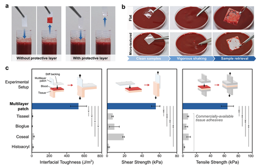 圖2 a)在豬血中浸沒之前和之后的帶有和不帶有疏水性液體層的多層貼片的照片。b)在豬血浴中劇烈搖動前后,帶有平坦和微紋理生物粘附層的多層貼片的照片。包含微織構生物粘附層的多層貼片表現出疏水性流體層更高的穩定性和拒血能力。c)比較多層貼劑和各種可商購的組織粘合劑的粘附性能,所述粘附劑粘附到涂有豬血的豬皮膚上。