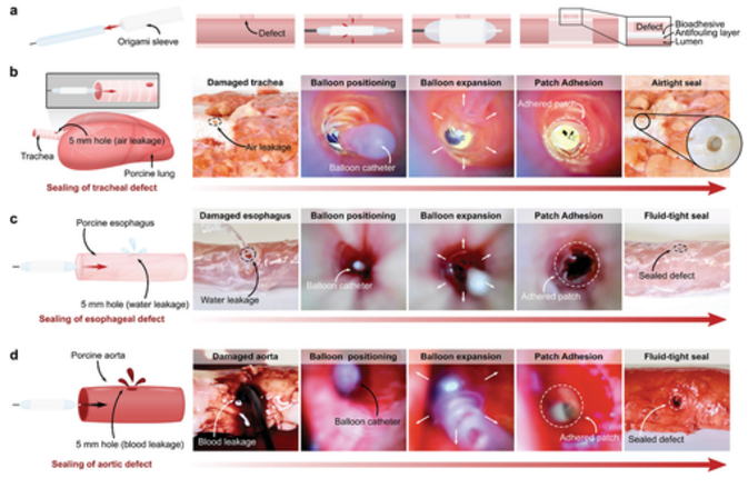 圖5 球囊導管微創遞送和多層生物粘附貼劑的離體演示。a)使用氣囊導管的折紙貼片整合和腔內遞送過程的示意圖。b)通過Foley導管遞送和應用多層貼片對豬氣管缺損(5毫米孔)進行氣密密封的宏觀和內窺鏡照片。c)肉眼和內窺鏡照片,這些照片是通過食道導管遞送和應用的貼片,對豬食道缺損(5毫米孔)進行的液密密封。d)通過Foley導管遞送和應用貼片對豬主動脈缺損(5毫米孔)進行液密密封的宏觀和內窺鏡照片。