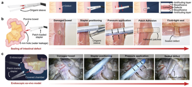 圖6 使用外科縫合器以微創方式遞送和應用多層生物粘附貼劑進行體外演示。a)使用鉸接式線性訂書機的貼片整合和遞送過程的示意圖。b)肉眼可見的豬腸道缺陷(5毫米孔)的線性密封,其是通過鉸接的線性縫合器遞送和施用的。c)內窺鏡檢查是在黑暗的,有蓋的室內進行豬腸缺損(5毫米孔)的密封,以模仿微創手術程序。