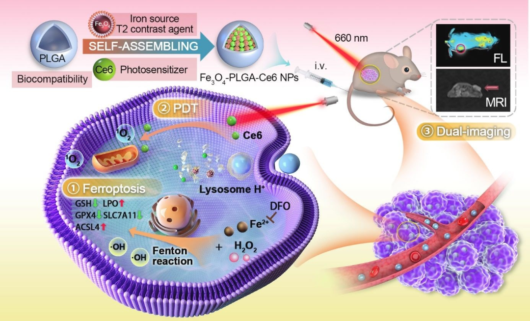 鐵死亡治療是利用鐵生物誘導物產生致死性脂質過氧化以誘導腫瘤細胞死亡,它也被認為是一種很有發展前景的癌癥治療策略。然而,如何增加腫瘤微環境(TME)中活性氧(ROS)的積累以提高其抗腫瘤療效仍是一個研究挑戰。西南大學宋楊教授和朱小康副教授設計了一種包覆有PLGA,含有鐵氧化物(Fe3O4)和光敏劑Ce6的聚納米系統Fe3O4-PLGA-Ce6,并將其用于協同鐵死亡-光動力抗癌治療。
