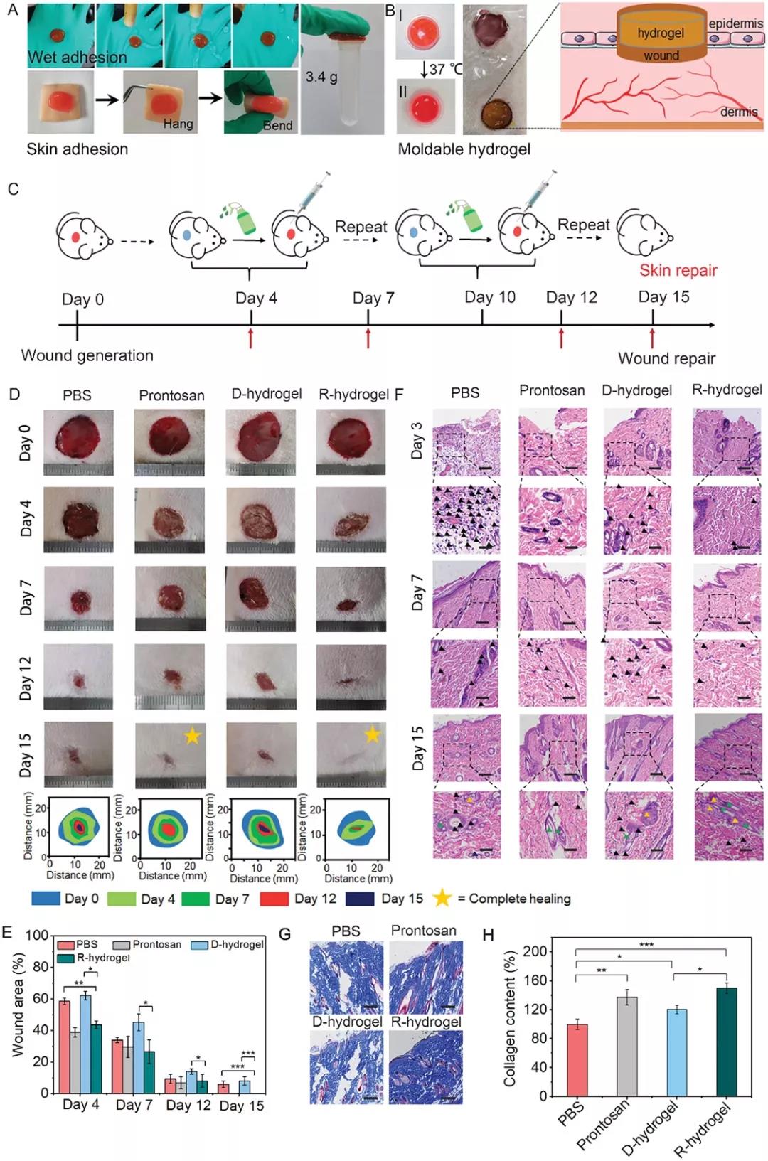 長期以來,水凝膠能在傷口界面處保持濕潤環境,吸收傷口滲出液,可充當微生物屏障并促進傷口愈合。在生理條件下原位形成的可注射水凝膠被認為是最有前途的傷口愈合材料。]然而,大多數可注射的水凝膠受到相對較長的膠凝時間,這會導致聚合物從目標部位擴散,誘發傷口感染。除快速覆蓋傷口外,在溫和條件下換藥也很重要。因為在換藥期間進行常規切割或機械清創術可能導致新表皮剝離,從而導致傷口增大和愈合延遲。因此,需要更有效的交聯方法來開發快速凝膠化和溶解速率的可注射水凝膠。