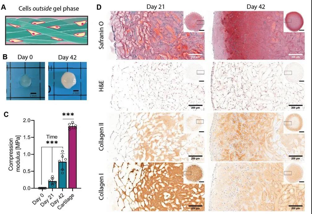 負載軟骨細胞的HA-MA纏結(jié)微束型凝膠培養(yǎng)42天后,凝膠塊呈白色軟骨狀,表明了致密的細胞外基質(zhì)沉積。為了證實這一點,研究者對培養(yǎng)的組織結(jié)構進行軟骨特異性標志物染色,染色結(jié)果表明相關的蛋白多糖、Ⅰ型膠原和Ⅱ型膠原均得到高表達,其中Ⅱ型膠原在42天后,膠原染色增強,表現(xiàn)為微束內(nèi)沉積及水凝膠網(wǎng)絡中的沉積。隨后,研究者對比了3D打印凝膠微束負載軟骨細胞培養(yǎng)21天及42天前后的壓縮模量,其模量由2.7 ± 0.3 kPa增加至212 ± 83.7 kPa,后增加至780.2 ± 218.4 kPa。雖然此機械強度遠不及原生軟骨組織的壓縮模量(1829.8 ± 72 kPa),但仍是一個顯著的進步。由于本研究中使用的材料本身的抗壓縮能力很小,壓縮模量的變化完全可以歸因于細胞外基質(zhì)的大量沉積和成熟(圖7)。