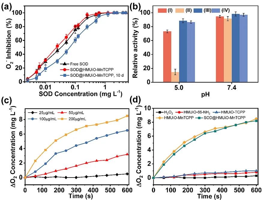 體外實驗結果表明該介孔MOFs作為載體可對負載的SOD提供良好的保護作用。在緩沖液中浸泡一段時間后,相比于游離的SOD,SOD@HMUiO-MnTCPP仍然具有較高的O2-抑制活性(圖4a,b)。同時,摻雜的Mn-TCPP配體賦予了HMUiO-MnTCPP類CAT活性,可將SOD催化O2-產生的H2O2進一步分解為H2O和O2(圖4c,d)。
