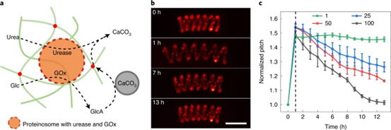 人工細胞樣群落參與多種化學相互作用模式,但與當地環境的接觸極少。最近,英國布里斯托大學Mei Li博士/Stephen Mann院士團隊開發了一種交互式微系統,該系統基于將一群酶活性半透性蛋白體固定在螺旋水凝膠絲內,以實現信號誘導運動。