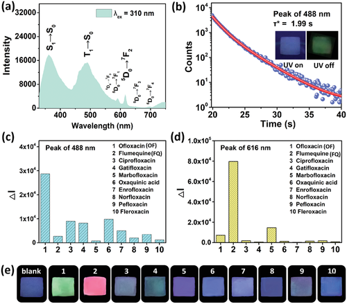 基于發(fā)光氫鍵有機(jī)骨架(HOF)的薄膜已成為光學(xué)應(yīng)用中最出色的材料之一,因此,開發(fā)簡便的合成方法并建立基于 HOF 的發(fā)光材料的多功能應(yīng)用至關(guān)重要。最近,同濟(jì)大學(xué)閆冰教授團(tuán)隊(duì)成功制備了雙發(fā)射 Eu3+功能化的HOF水凝膠薄膜 (1)。1在關(guān)閉紫外燈時(shí)發(fā)出藍(lán)綠色長余輝,長余輝壽命達(dá)到1.99 s。1對氧氟沙星和氟甲喹的選擇性好、靈敏度高、檢出限低,對氧氟沙星和氟甲喹的檢測符合色度和比值模式。