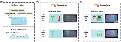 深入研究了1對氧氟沙星和氟甲喹的熒光響應(yīng)機(jī)制,進(jìn)一步利用這些機(jī)制構(gòu)建了一個(gè)具有高安全性的防偽平臺。基于薄膜的防偽平臺可以根據(jù)不同的熒光響應(yīng)按需進(jìn)行信息加密,還可以通過控制長余輝強(qiáng)度和激發(fā)光來獲取特定信息。該研究不僅提供了制備雙發(fā)射 Eu3+功能化 HOF 基水凝膠薄膜的代表性案例,而且為 HOF 基薄膜作為多功能智能發(fā)光材料開辟了可能性。相關(guān)論文以題為Facile Fabrication of Luminescent Eu(III) Functionalized HOF Hydrogel Film with Multifunctionailities: Quinolones Fluorescent Sensor and Anticounterfeiting Platform發(fā)表在《Advanced Functional Materials》上。