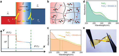 圖1 在零下溫度下工作的熱電池的設計。在零下溫度下工作的熱電池的設計。a) 電荷的電化學勢(𝜇~)攜帶圖和可逆氧化還原反應 Fe3++e−⇋ Fe2+的相應電壓分布,其中 E 表示內建電場。b) 在溫度梯度下含有交聯網絡、EG 和水的有機水凝膠熱電池的示意圖。額外的 EG 可以破壞冰晶格,從而在零度以下的溫度下擴大工作溫度。c) FeCl3 以及 DMAEA-Q 和 FeCl3 在 EG 和水的二元溶劑體系中的混合物的 UV-vis 光譜。d) FeCl2 以及 DMAEA-Q 和 FeCl2 在 EG 和水的二元溶劑體系中的混合物的紫外-可見光譜。e) 柔軟且可拉伸的有機水凝膠熱電池的照片。