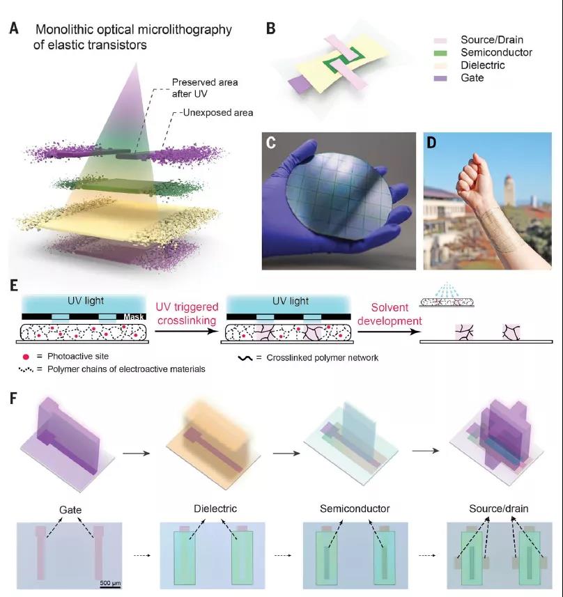 近日,斯坦福大學鮑哲南團隊提出了一種單片光學微光刻工藝,該工藝通過連續(xù)紫外光觸發(fā)溶解度調(diào)制,直接對彈性電子材料進行圖案化。研究人員制作了溝道長度為2微米的晶體管,密度高達42000個晶體管/每平方厘米。基于該方法還構建了包含異或門和半加法器的彈性電路(兩者都是算術邏輯單元的基本組件)。該工藝為實現(xiàn)復雜、高密度、多層彈性電路的晶圓級制造提供了思路,且性能可與剛性電路相媲美。該研究以“Monolithic optical microlithography of high-density elastic circuits”為題發(fā)表在最新一期的《Science》上。據(jù)了解這是鮑哲南院士2020到現(xiàn)在的第三篇Science!(連發(fā)2篇《Science》,柔性電子女神,鮑哲南院士2020年成果集錦)