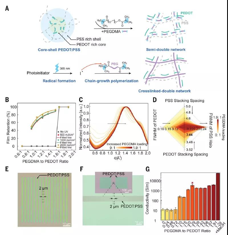 PEDOT:PSS的溶解度可以通過將物理交聯(lián)導電網(wǎng)絡嵌入共價交聯(lián)PEGDMA網(wǎng)絡來實現(xiàn)。PEDOT與PEG連接劑之間的強相互作用導致PEDOT:PSS的微觀結構從核殼結構轉變?yōu)楦L的鏈,從而形成了第一個導電網(wǎng)絡(圖2A)。在紫外光(365 nm)引發(fā)后,丙烯酸二甲酯(DMA)修飾的聚乙二醇經(jīng)過快速自由基聚合形成第二個網(wǎng)絡。兩個網(wǎng)絡之間強烈的分子間相互作用使暴露于紫外線的區(qū)域能夠抵抗水,而未暴露的區(qū)域仍然是水溶性的。這種光圖案化能力與PEGDMA/PEDOT的配比極為相關,PEGDMA不足會導致薄膜耐腐蝕性差,而過多則會導致紫外線曝光前就形成交聯(lián)(圖2A,B)。隨著PEG連接劑的增加,PEDOT分子間的鏈間偶聯(lián)更強,PEDOT π-π堆積距離逐漸減小,形成更大的晶粒(圖2C,D)。通過調(diào)整合適的配比(1.15:1 PEGDMA/PEDOT),實現(xiàn)了分辨率2 μm的圖案化(圖2E,F(xiàn))。此外,PEGDMA的加入也大大提高了PEDOT:PSS的電導率。