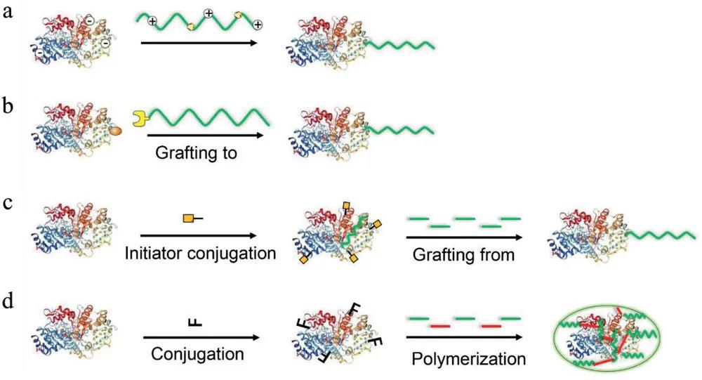 (2)作者在文中綜述了利用保護性聚合物殼對酶進行包裹的方法,介紹了制備聚合物酶的方法,包括物理吸附和化學偶聯等;并結合應用實例,對聚合物酶的合理設計進行了總結;隨后,作者也對該領域研究的重點和發展進行了討論和展望。