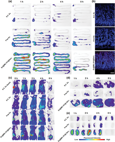 此外,MOF-Gel 納米顆粒顯示出超過 40% 的高 exendin-4 負載含量,并且肽在含有磷酸鹽的溶液中快速釋放。與沒有水凝膠殼或帶單電荷水凝膠殼的 MOF 納米顆粒相比,具有兩性離子水凝膠殼的 MOF 納米顆粒顯示出增強的粘液滲透和 Caco-2 和 E12 細胞的細胞內化。基于熒光成像,在空腸注射到 BALB/c 裸鼠后,含有羅丹明 B 標記的 exendin-4 的 Ex@MIL101@Gel± 納米顆粒與游離的 exendin-4 相比表現出增強的腸道 exendin-4 吸收。此外,Au@MIL101@Gel±@Cap 的口服給藥進一步證實了口服給藥的 MOF-Gel 納米顆粒的有效腸道吸收。在糖尿病大鼠模型中口服給藥后,Ex@MIL101@Gel±@Cap 導致血漿 exendin-4 水平顯著升高,有效刺激內源性胰島素分泌,對糖尿病大鼠產生顯著的降血糖作用,具有顯著的降血糖作用。相對藥理利用率為 17.26%。與口服胰島素治療相比,使用 exendin-4 發生低血糖的風險較低。包括水凝膠包覆的MOF納米顆粒和pH響應膠囊在內的載體材料可以輕松獲得,高DLE和exendin-4顯著增強的口服利用度促進了成本節約,同時為糖尿病患者提供了極大的便利和依從性優勢.因此,含有兩性離子水凝膠包被的 MOF 納米顆粒的腸道環境觸發的自解包膠囊作為載體具有巨大的潛力,可以克服口服肽遞送以有效治療糖尿病的關鍵障礙。