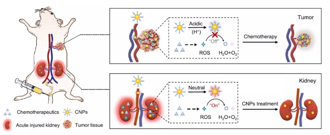 鑒于此,浙江大學凌代舜課題組在《Nature Communication》上發表了Catalytic activity tunable ceria nanoparticles prevent chemotherapy-induced acute kidney injury without interference with chemotherapeutics為題的研究,該研究設計了一種催化活性可調的二氧化鈰納米粒子(CNPs),可以防止化療引起的 AKI,但不會干擾化療作用。具體來說,在腎皮層中性環境中CNP催化分解H2O2,然后通過激活Nrf2/Keap1信號通路來調節與ROS有關的基因表達,恢復ROS平衡保護腎小管;在腫瘤酸性微環境下,CNP由于高濃度的H+破壞了其活性催化位點進而限制其的抗氧化作用,從而不干擾化療生成的ROS來殺死癌細胞。作為 ROS調節劑,CNP這種條件依賴型可調的催化活性,在癌癥患者的 AKI 臨床預防和治療方面具有巨大潛力。