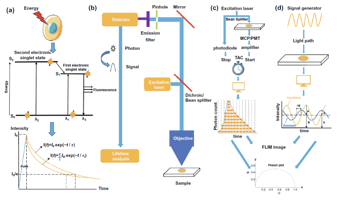圖2. 熒光時(shí)間,熒光成像,TCSPC-FLIM和頻域FLIM的基本概念。(a) 熒光時(shí)間測(cè)量的基本原理。(b) 配備有熒光時(shí)間分析裝置的熒光成像儀的基本構(gòu)造。(c) TCSPC-FLIM裝置示意圖。(d) 頻域FLIM裝置示意圖。