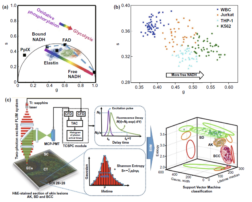 圖4. FLIM相量圖以及多參數(shù)FLIM分類(lèi)系統(tǒng)用于癌癥領(lǐng)域的相關(guān)研究。(a) FLIM相量圖的繪制原理,通過(guò)對(duì)相量圖中自發(fā)熒光分子相量點(diǎn)位置等信息的分析可以獲得不同檢測(cè)樣本中細(xì)胞氧化磷酸化、糖酵解等代謝變化信息。(b) 利用FLIM相量圖中不同樣本中得到的熒光分子集群式分布差異,反應(yīng)不同檢測(cè)樣本中細(xì)胞代謝差異,基于此對(duì)白血病細(xì)胞亞型進(jìn)行分類(lèi)和診斷。(c) 利用support vector system輔助基底細(xì)胞癌(BCC),光化性角化病(AK)和鮑溫病(BD)的診斷分型。