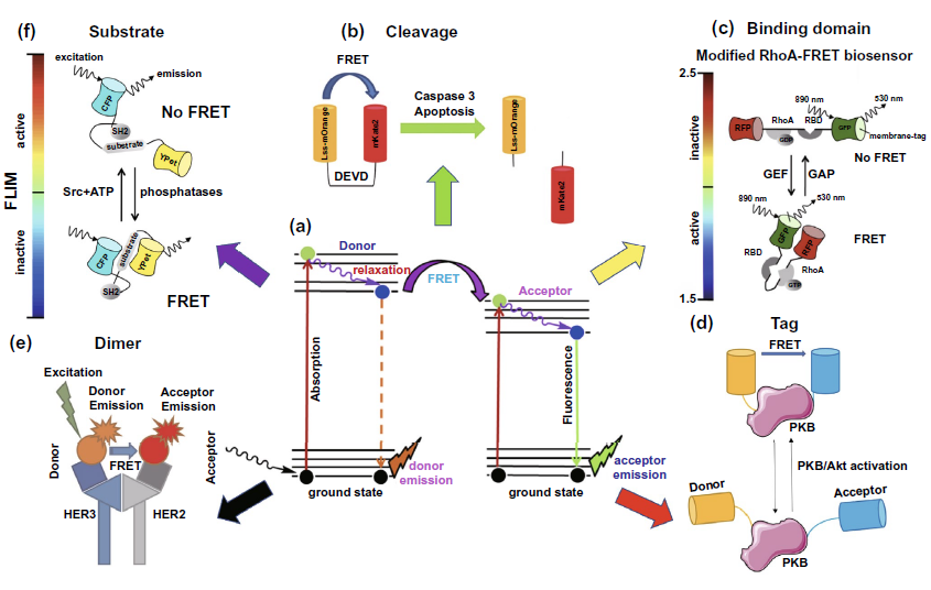 圖5. FLIM-FRET在癌癥診斷和療效提升領(lǐng)域內(nèi)的應(yīng)用。(a) FRET熒光分子對(duì)中熒光供體和受體分子間FRET現(xiàn)象的模式簡(jiǎn)圖。(b) cleavage型:利用FRET-FLIM對(duì)caspase3的活性進(jìn)行檢測(cè)指示細(xì)胞凋亡狀態(tài)。(c) Binding domain型:利用FRET-FLIM對(duì)RhoA蛋白的活性進(jìn)行檢測(cè),通過(guò)相連的RFP和GFP熒光蛋白分子間是否發(fā)生FRET現(xiàn)象評(píng)估RhoA蛋白活性。(d) Tag型:利用標(biāo)記在PKB蛋白上相連的絲氨酸和蘇氨酸熒光分子標(biāo)記的FRET效應(yīng)變化評(píng)估胞內(nèi)PKB/Akt信號(hào)通路活性。(e) Dimer型:利用在HER3和HER2上標(biāo)記的Alexa546和Cy5熒光分子對(duì)的FRET現(xiàn)象對(duì)細(xì)胞膜上HER3-HER2二聚體水平進(jìn)行檢測(cè)。(f) Substrate型:利用Src與底物反應(yīng)后導(dǎo)致底物相連的CFP和YPet熒光蛋白分子間FRET效應(yīng)消失的現(xiàn)象對(duì)細(xì)胞內(nèi)Src蛋白的活性進(jìn)行檢測(cè)。