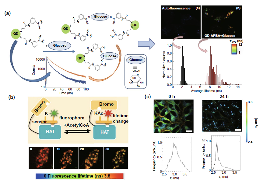 細(xì)胞內(nèi)的分子變化FLIM檢測(cè)可以分為核內(nèi)和細(xì)胞質(zhì)內(nèi)兩類(lèi),在細(xì)胞核內(nèi)部分圖6a論述的是結(jié)合一種乙酰轉(zhuǎn)移酶活性生物傳感器(HATS)實(shí)現(xiàn)對(duì)乙酰轉(zhuǎn)移酶活性的檢測(cè)從而輔助針對(duì)組蛋白乙酰化的抗癌藥物療效評(píng)估。在細(xì)胞質(zhì)內(nèi),F(xiàn)LIM則可以結(jié)合新型量子點(diǎn)和熒光標(biāo)記的香豆素探針實(shí)現(xiàn)對(duì)細(xì)胞質(zhì)內(nèi)兩大代謝情況-糖代謝和脂代謝的監(jiān)測(cè),輔助癌細(xì)胞的代謝研究和臨床診治應(yīng)用(圖6a,c)。