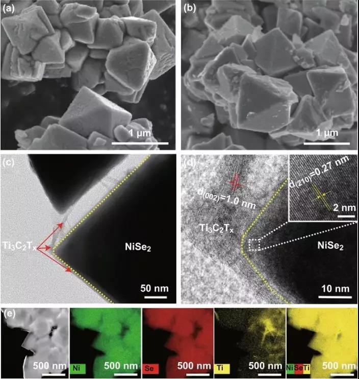 圖1 不含(a)和含(b)Ti3C2Tx復合物的NiSe2的SEM圖像。(c,d)不同放大倍數的NiSe2/Ti3C2Tx復合物的TEM圖像。(e)HAADF−STEM圖像的NiSe2/Ti3C2Tx混合和相應的EDX元素映射的Ni, Se,和Ti元素。