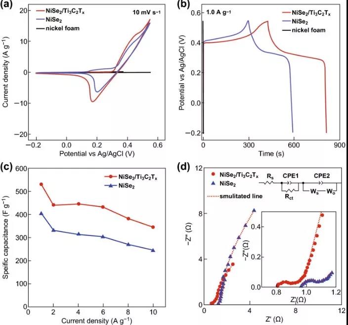 圖3 超級電容器在2 M KOH溶液中的性能: (a) 未修飾NiSe2和NiSe2/Ti3C2Tx在10 mV/s掃速下的CV圖。(b)未修飾NiSe2和NiSe2/Ti3C2Tx在1.0 A/g電流密度下的GCD曲線。(c)未修飾NiSe2和NiSe2/Ti3C2Tx的電流密度比容圖。(d)未修飾的NiSe2和NiSe2/Ti3C2Tx的Nyquist圖(插圖為高頻區域和擬合實驗數據的等效電路)