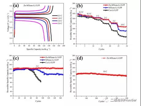 圖4. a) Zn-MXene-Li/LFP 電池在不同倍率 (0.5- 5.0 C) 下的選定放電-充電曲線。b) Zn-MXene-Li//LFP、MXene-Li//LFP 以及 Cu-Li//LFP 電池的倍率能力,即使在 10 C 下也表現出良好的倍率能力。c) Zn-MXene-Li 的循環性能 //LFP、MXene-Li//LFP 以及 2 C 下的 Cu-Li//LFP 電池。d) Zn-MXeneLi//LFP 電池在 10 C 下的長循環性能。(C=170 mA g -1 )