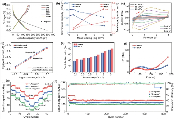 結合進一步的硫改性,Ti3C2Tx氣凝膠電極作為鈉離子存儲的獨立負極顯示出有希望的電化學性能。即使在12.3 mg cm-2的超高負載質量下,在0.1 A g-1的電流密度下也實現了1.26 mAh cm-2的高面積容量,這具有實際意義。