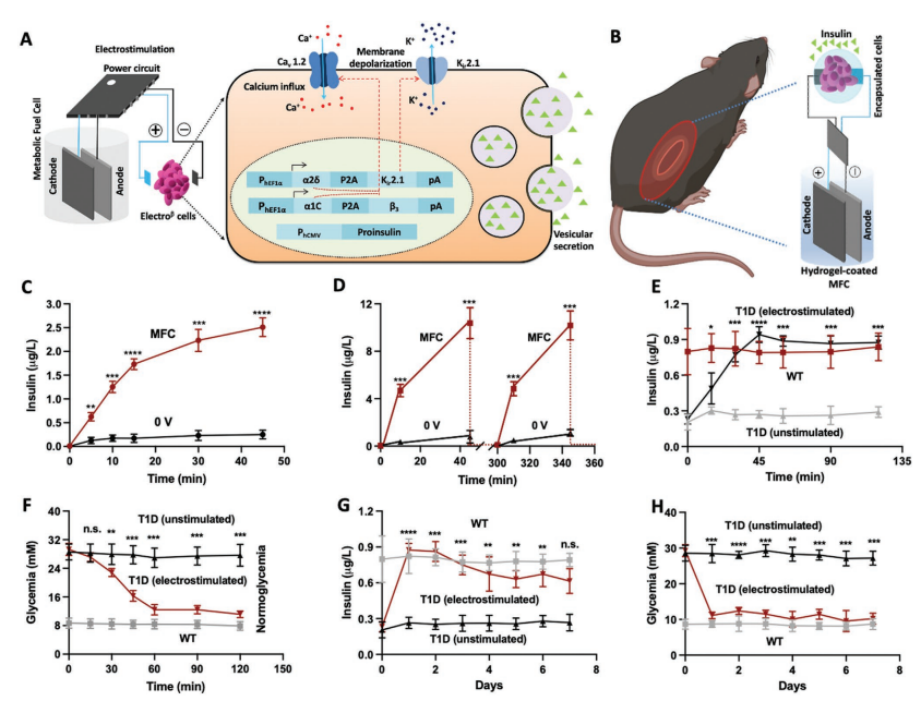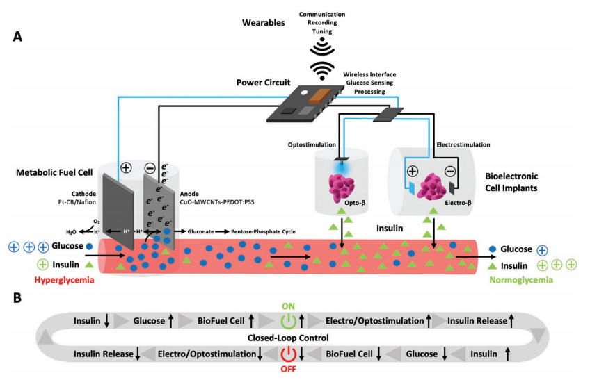 目前可用的生物電子設備消耗太多的能量,無法在可充電電池上連續運行,而且通常是無線供電,伴隨著可靠性、便利性和移動性等問題。因此,一種在生理條件下工作的強大的、自給自足的、可植入的發電機的可用性將對許多應用產生革命性的影響,從驅動生物電子植入物和假體到編程細胞行為和患者的新陳代謝。在這里,利用一種新的含銅、導電性調諧的3D碳納米管復合材料,設計了一種可植入的血糖代謝燃料電池,該電池可以連續監測血糖水平,在高血糖期間將多余的葡萄糖轉化為電能,并產生足夠的能量(0.7 mW/cm-2, 0.9 V, 50 mM葡萄糖)來驅動工程細胞泡狀胰島素釋放的光和電遺傳調節。研究表明,在I型糖尿病的實驗模型中,通過結合電代謝轉化和胰島素釋放介導的細胞消耗,將血糖監測與消除過量血糖相結合,使代謝燃料電池能夠以自動、自給自足和閉環的方式恢復血糖穩態。