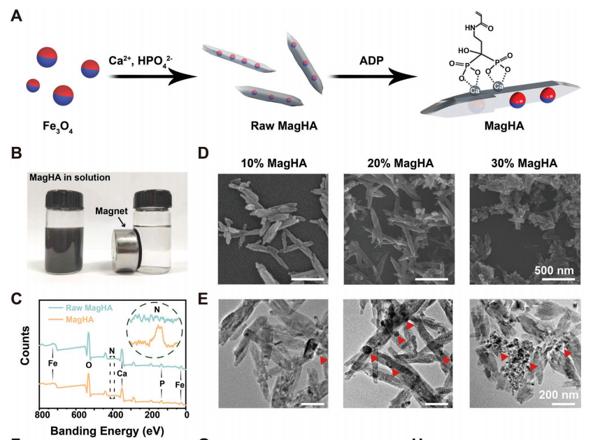 分層骨軟骨缺損的修復需要復雜的梯度重建;然而,很少有連續梯度鑄造的策略考慮到與臨床實際有關的細胞適應性、多個梯度元素和精確的梯度鏡像原生組織。在這里,利用合成的超順磁性HA納米棒(MagHA)開發了一種具有納米羥基磷灰石(HA)、力學和磁性連續梯度的水凝膠,該納米棒易于對磁場做出響應。根據健康兔膝關節的磁共振成像(MRI)計算出優化的精確重建骨軟骨組織梯度模式。然后,MagHA形成連續的生物理化梯度,從而在外部磁刺激下產生增量HA、機械和電磁信號。為了使這種依賴深度的物體起作用,開發了一種適應性強的水凝膠來促進細胞滲透。將該方法應用于兔全層骨軟骨缺損的局部磁場修復,這種多層梯度復合水凝膠以完美的異質特征修復骨軟骨單元,模仿軟骨向軟骨下的逐漸過渡。