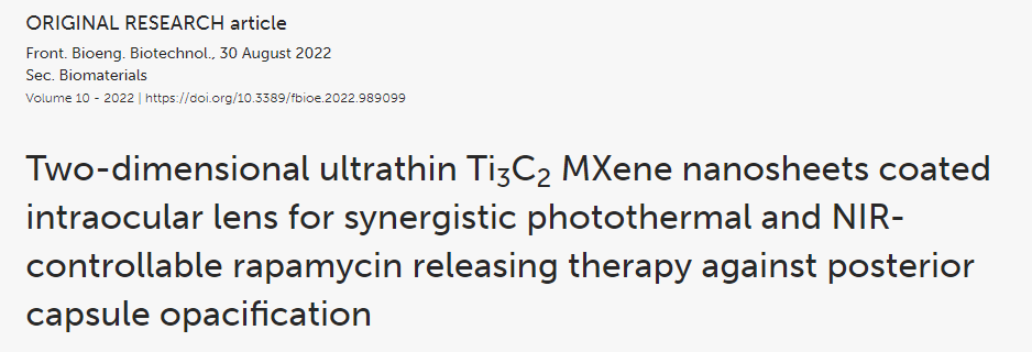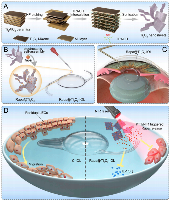 后囊膜混濁(PCO)是白內障術后最常見的遲發性并發癥之一。設計了多種藥物洗脫人工晶狀體(IOL),以實現藥物的持續釋放,抑制白內障術后眼部炎癥、晶狀體上皮細胞(LECs)的增殖和后發性白內障的發生。盡管在該領域已有進展,但載藥IOL存在眼毒性、載藥能力不足、釋放時間短等問題。為了防止PCO的發生并解決這些問題,本研究采用兩步自旋涂層法,由二維超薄Ti3C2 MXene納米片和雷帕霉素(Rapa)制備了一種新型載藥IOL (Rapa@Ti3C2-IOL)。Ti3C2作為Rapa的給藥庫。Rapa@Ti3C2-IOL具有光熱和近紅外(NIR)可控的協同釋藥特性。結果表明,Rapa@Ti3C2-IOL具有制備簡單、透光率高、光熱轉化能力優異、NIR可控的釋藥行為等優點。在溫和的808 nm近紅外激光(1.0 W/cm−2)照射下,Rapa@Ti3C2涂層有效地消除了Rapa@Ti3C2-IOL周圍的LECs。此外,NIR可控的Rapa釋放抑制了LEC的遷移,抑制了體外光熱治療后的炎癥反應。然后將Rapa@Ti3C2-IOL植入鼠兔眼內,觀察4周后預防PCO的有效性和生物相容性。在近紅外照射下,Rapa@ Ti3C2-IOL植入物具有良好的PCO預防能力,對周圍健康組織無明顯病理損傷。本研究提供了一種具有協同光熱和NIR可控的超薄Ti3C2 MXene納米片IOL來預防PCO的有希望的策略Rapa釋放屬性。