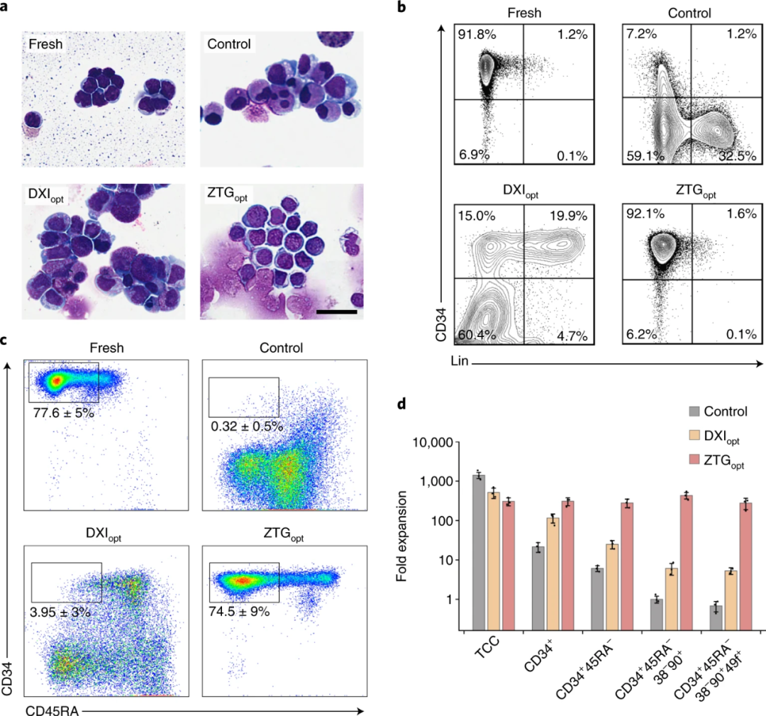 研究人員利用ZTG opt與優(yōu)化的Delta1 ext-IgG(DXI)以及作為未修飾的TCPS培養(yǎng)瓶三種方式分別培養(yǎng)HSPC,發(fā)現(xiàn)ZTG opt培養(yǎng)后,該HSPC的原始細(xì)胞同質(zhì)性得以保留,而DXI 與TCPS培養(yǎng)瓶的培養(yǎng)方式均會(huì)導(dǎo)致細(xì)胞出現(xiàn)顆粒狀胞質(zhì)和不規(guī)則的核等異質(zhì)性表型。如圖2所示,在整個(gè)培養(yǎng)期間,ZTG opt種群保持CD34高表達(dá),ZTG opt擴(kuò)增后的細(xì)胞中CD34 +占93.7%±2%,表明ZTG水凝膠3D培養(yǎng)方式可抑制HSPC分化。