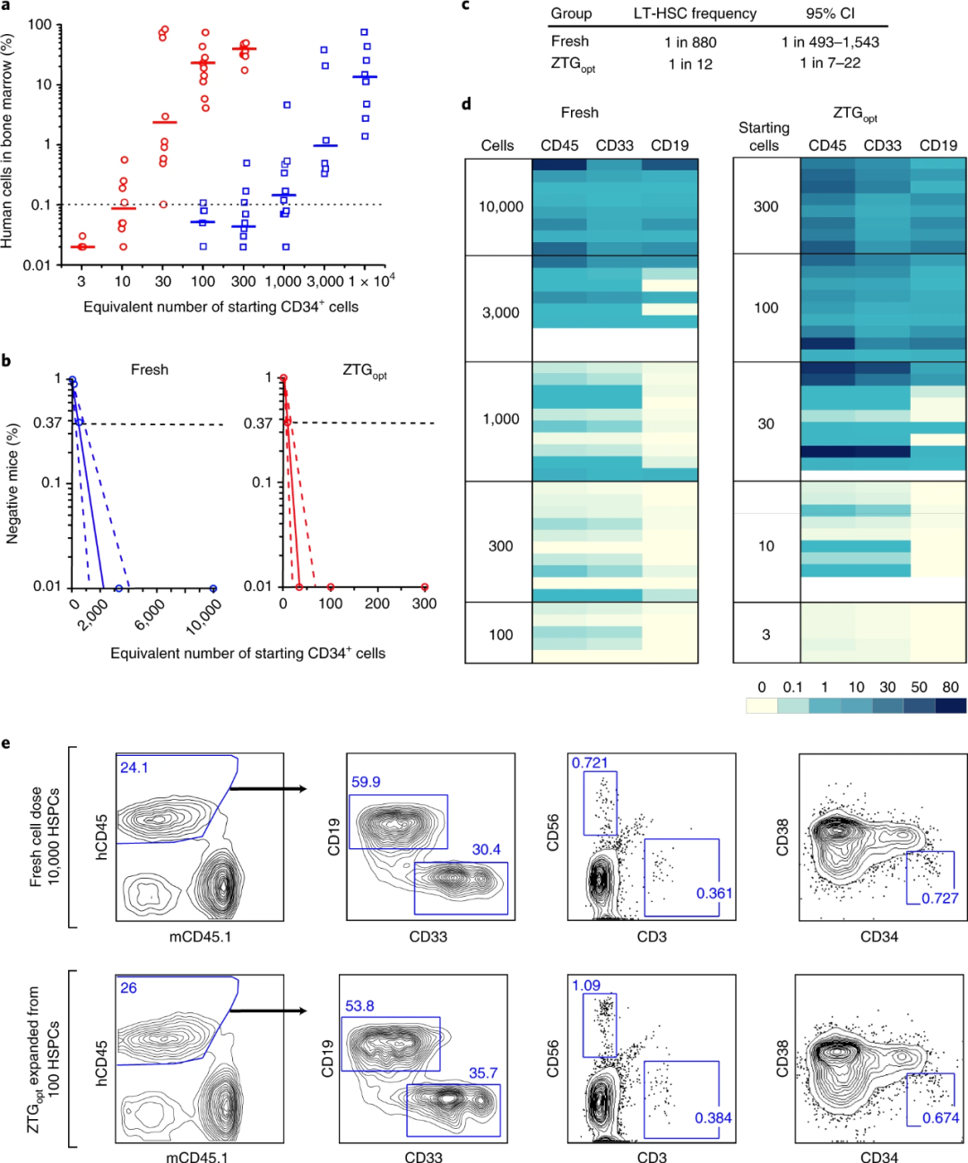 ZTG opt方式培養(yǎng)的臍帶血來(lái)源的CD34 + HSPC在體內(nèi)可保持?jǐn)U增能力已得到證明,研究人員又利用有限稀釋分析(LDA)來(lái)檢測(cè)中長(zhǎng)期再生造血干細(xì)胞(LT-HSC)的擴(kuò)增頻率的情況。實(shí)驗(yàn)結(jié)果如圖3所示,在移植后24–30周后,ZTG opt方式培養(yǎng)的LT-HSC的擴(kuò)增頻率遠(yuǎn)高于其他培養(yǎng)方式。有限稀釋分析和二次移植實(shí)驗(yàn)均證明ZTG培養(yǎng)擴(kuò)增了具有長(zhǎng)期造血功能的LT-HSC細(xì)胞。