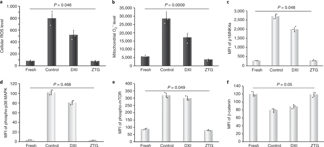 在正常生理狀態(tài)下,原始的HSPC駐留在低氧的生態(tài)位中,可限制細(xì)胞產(chǎn)生ROS進(jìn)行自我保護(hù)。為了探討了 ZTG 水凝膠3D培養(yǎng)是否可以限制ROS的產(chǎn)生并保護(hù)封裝的HSPC,研究人員檢測(cè)了各系統(tǒng)中培養(yǎng)1天后的細(xì)胞反應(yīng),如圖4所示,對(duì)比DXI組和對(duì)照組,ZTG組的細(xì)胞ROS和線粒體超氧化物水平偏低且非特異性信號(hào)通路無(wú)明顯激活,有利于HSPC增強(qiáng)自我更新。