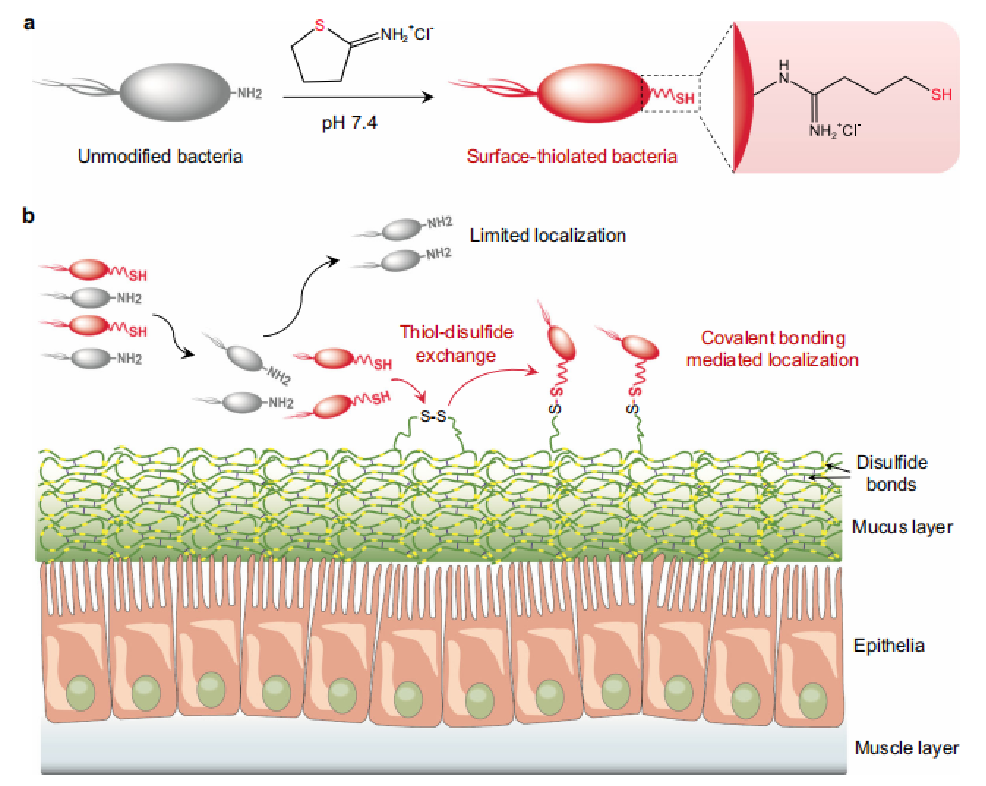 一種原位化學反應介導的細菌共價定位的策略。通過簡單的一步酰亞胺酯反應,細菌表面的初級氨基可以在細胞相容性條件下轉化為游離硫醇。表面硫化作用適用于修飾不同的菌株,每個細菌引入的硫醇的數量可以很容易地通過不同的飼料比例來調整。這些化學反應性細菌能夠通過粘蛋白相關的二硫化物和細菌表面新轉化的硫醇之間的無催化劑的硫醇-二硫化物交換自發地與粘液層結合,并表現出硫化水平依賴的附著。